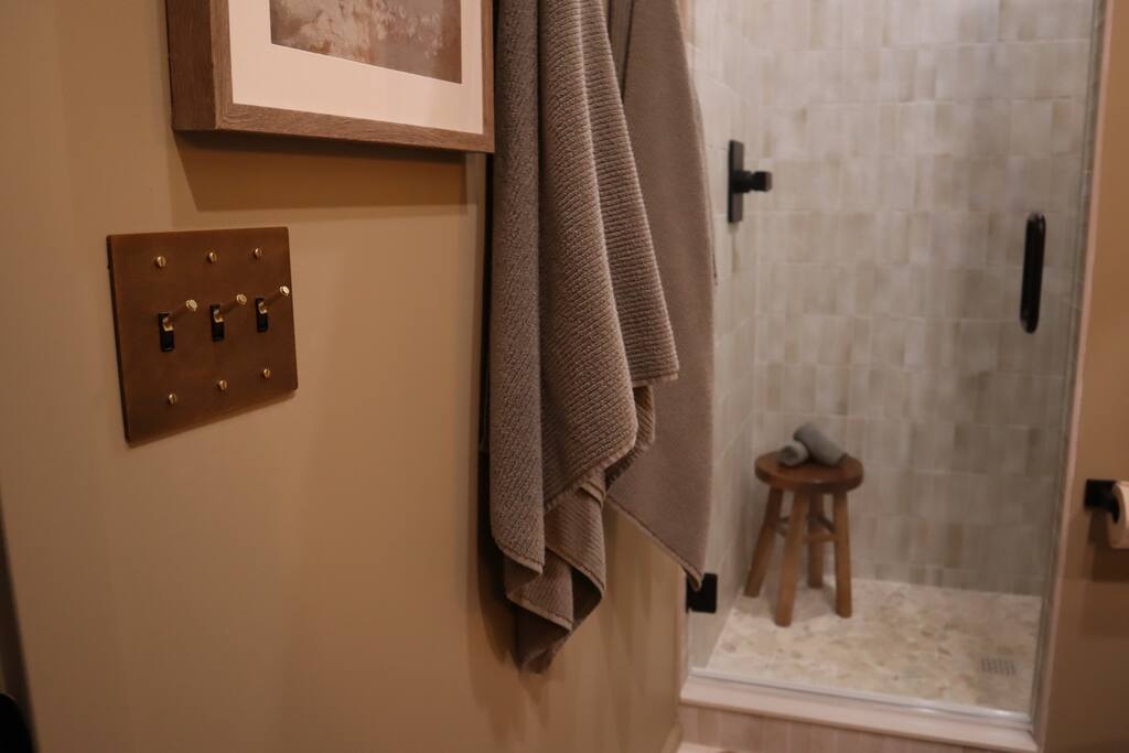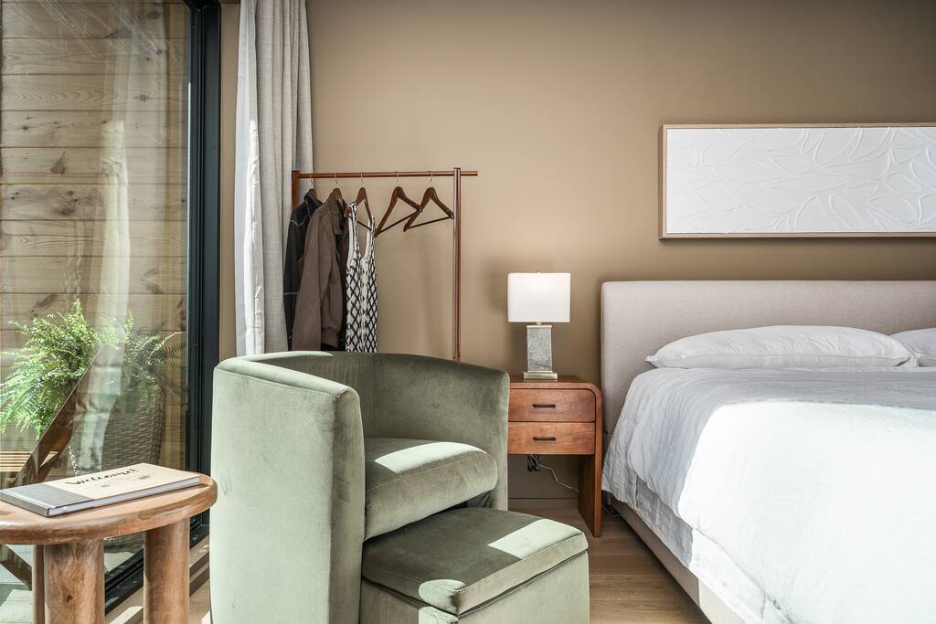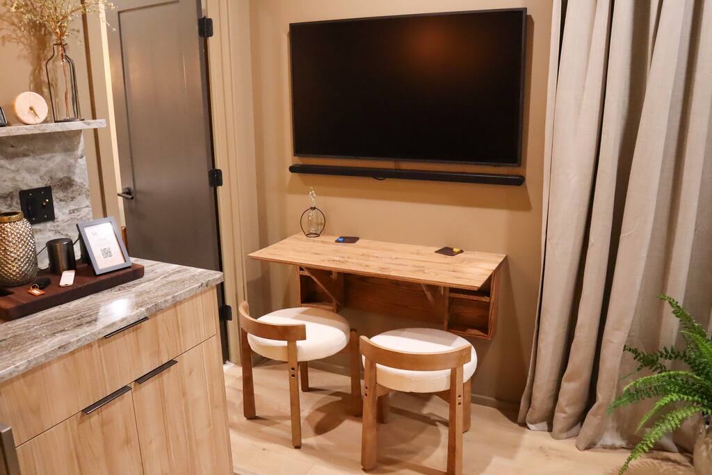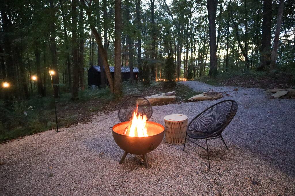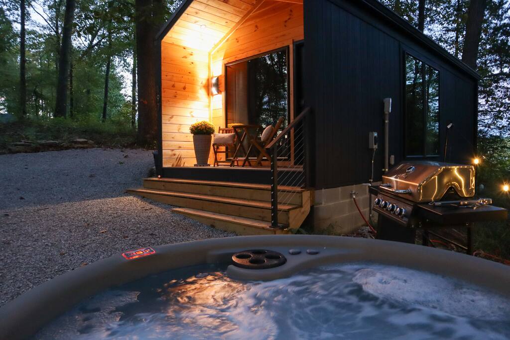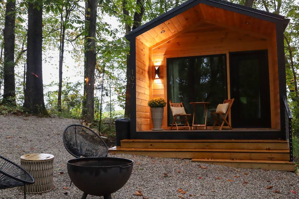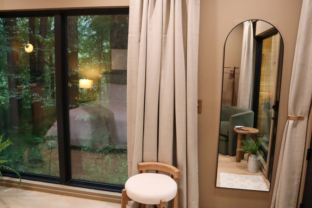 This thoughtfully designed tiny home combines modern charm with refined touches for a stay that feels equal parts cozy and elevated. Though the footprint is small, the space lives large. With tall ceilings, a king bed, and elegant design details throughout. A double vanity makes it easy to get ready without missing a beat, and the double-headed shower adds a spa-like feel to your daily routine. Want to cook in? You’ll find a hot plate and Breville toaster oven/air fryer combo tucked away, ready to be pulled out when you're feeling like a chef. Pair that with a local coffee setup in the morning, and you’ve got everything you need to settle in and savor your time. From the fire pit, to the hot tub, to quiet mornings on the porch; this is the kind of stay where simplicity shines. Everything you need to unplug (or stream your favorite shows in comfort). ✨ And for friends or family traveling together, we also offer a second identical tiny home just steps away, perfect for two couples looking to share a getaway while still enjoying their own private space.